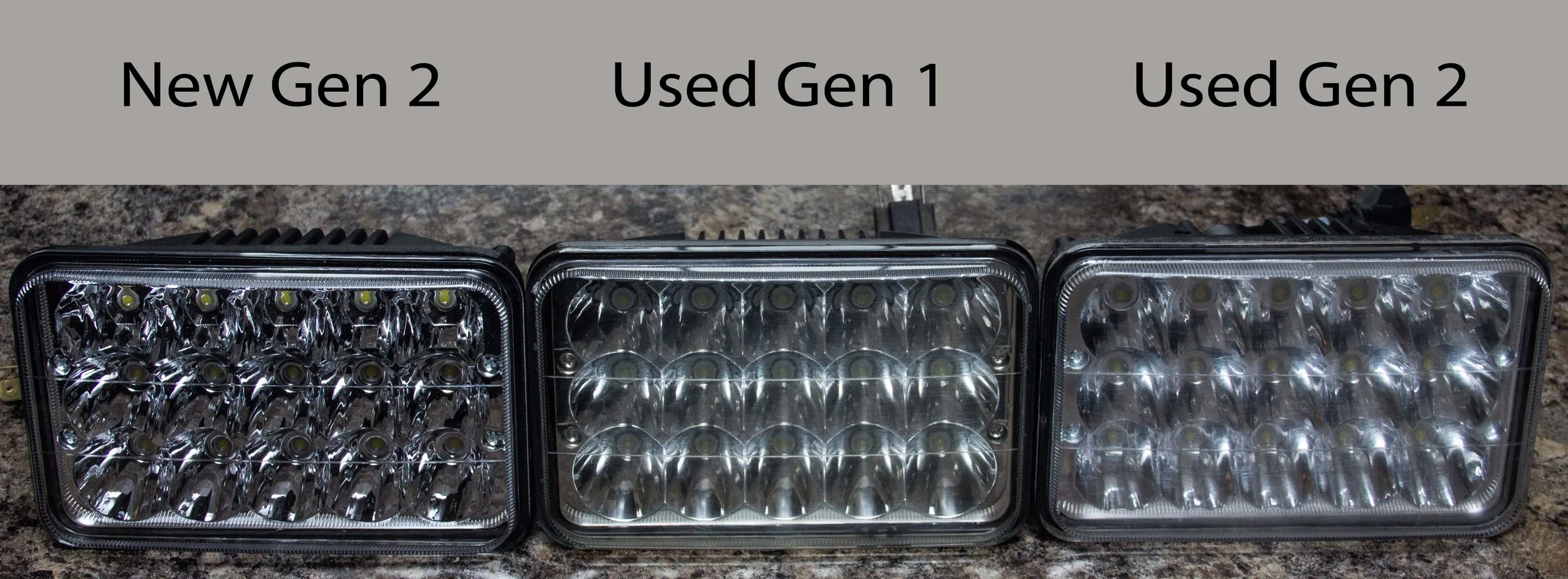 This picture shows the lens from a new M-LIGHT headlight compared to a used M-LIGHT and a used Gen 1. These three headlights have approximately 90,000km of driving on them each.